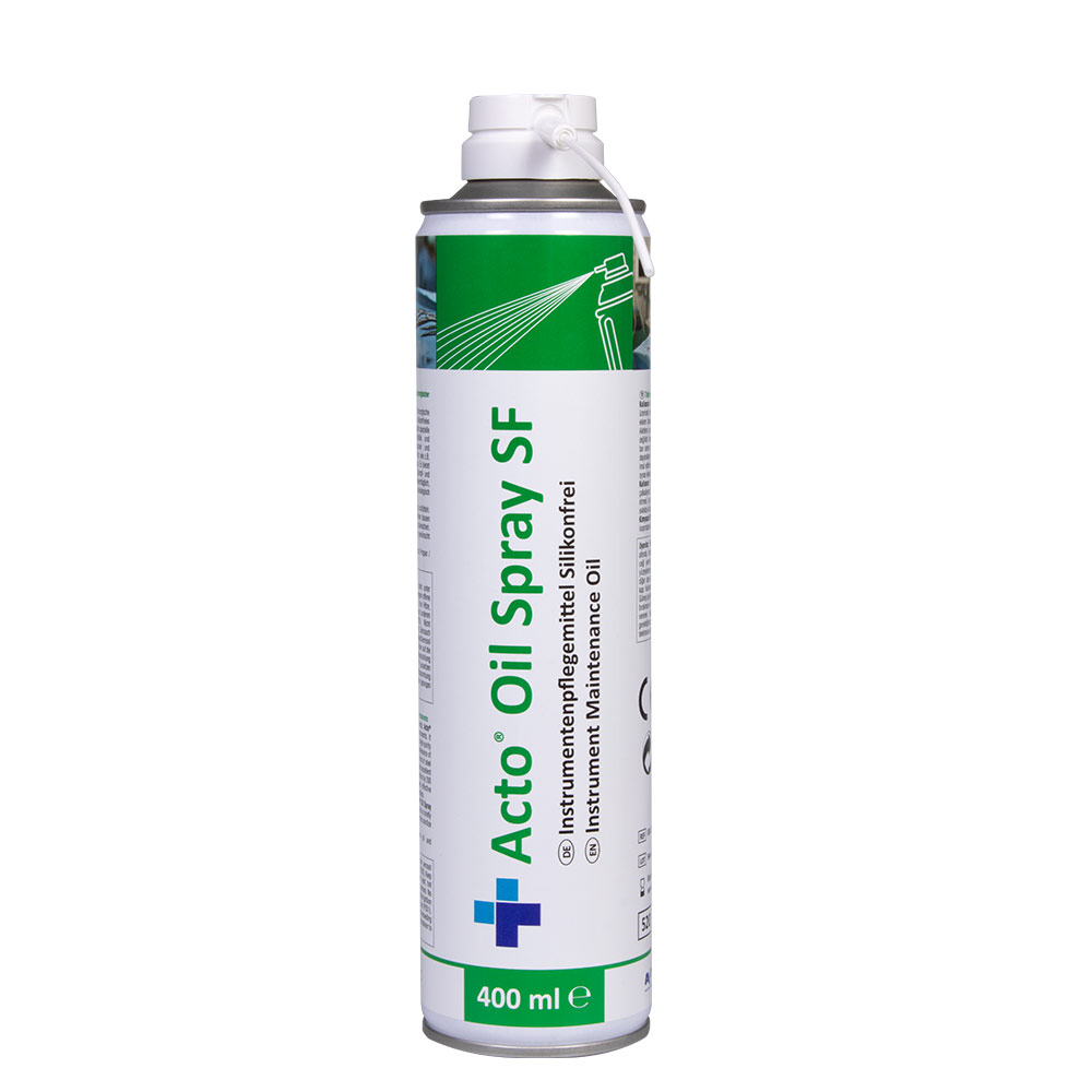 Acto® Oil Spray SF, is a silicone-free maintenance spray. Forms a thin layer of protection on the instruments and extends their life by providing joint care. Does not damage the instruments. Prevents formation of corrosion in regular use. Suitable for use as frequent as desired. Does not prevent sterilization after spraying. Resistant to temperatures up to 200 °C.