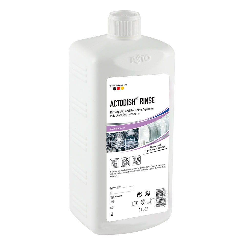Actodish® Rinse a rinsing aid developed for industrial dishwashers. Provides dry dishes with no stains. Prevents lime buildup and water spots. Delivers shiny dishware.