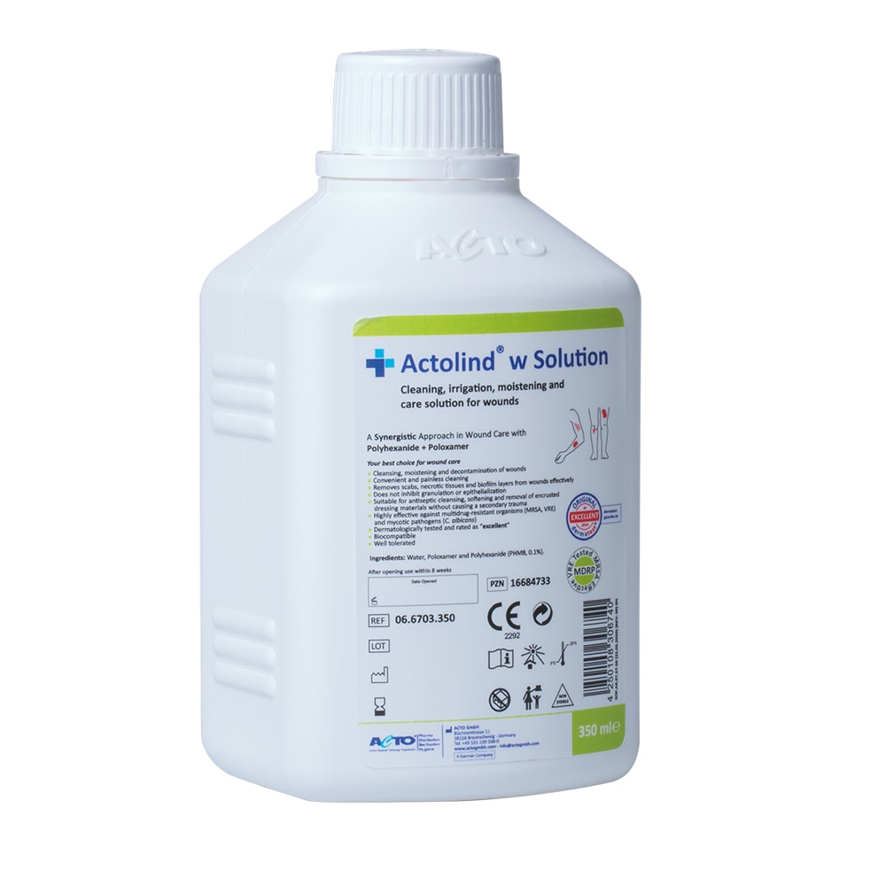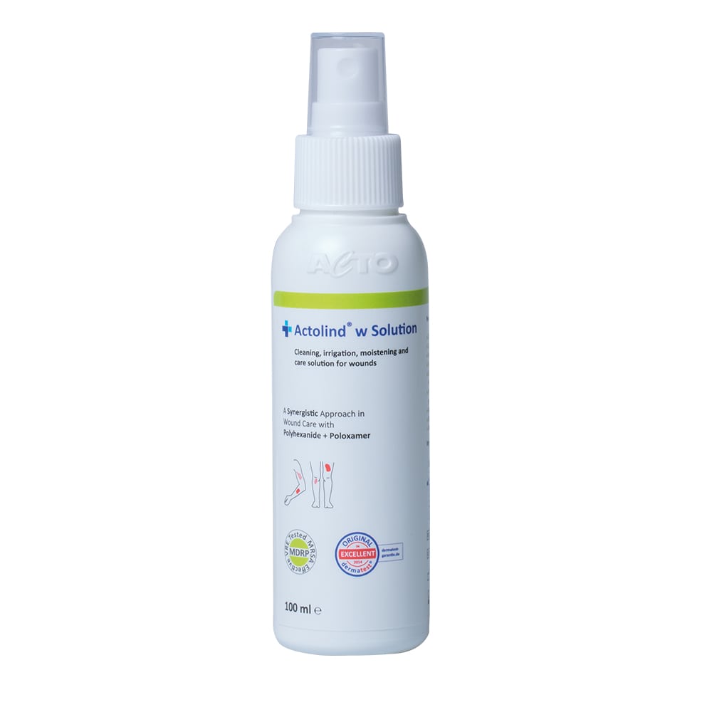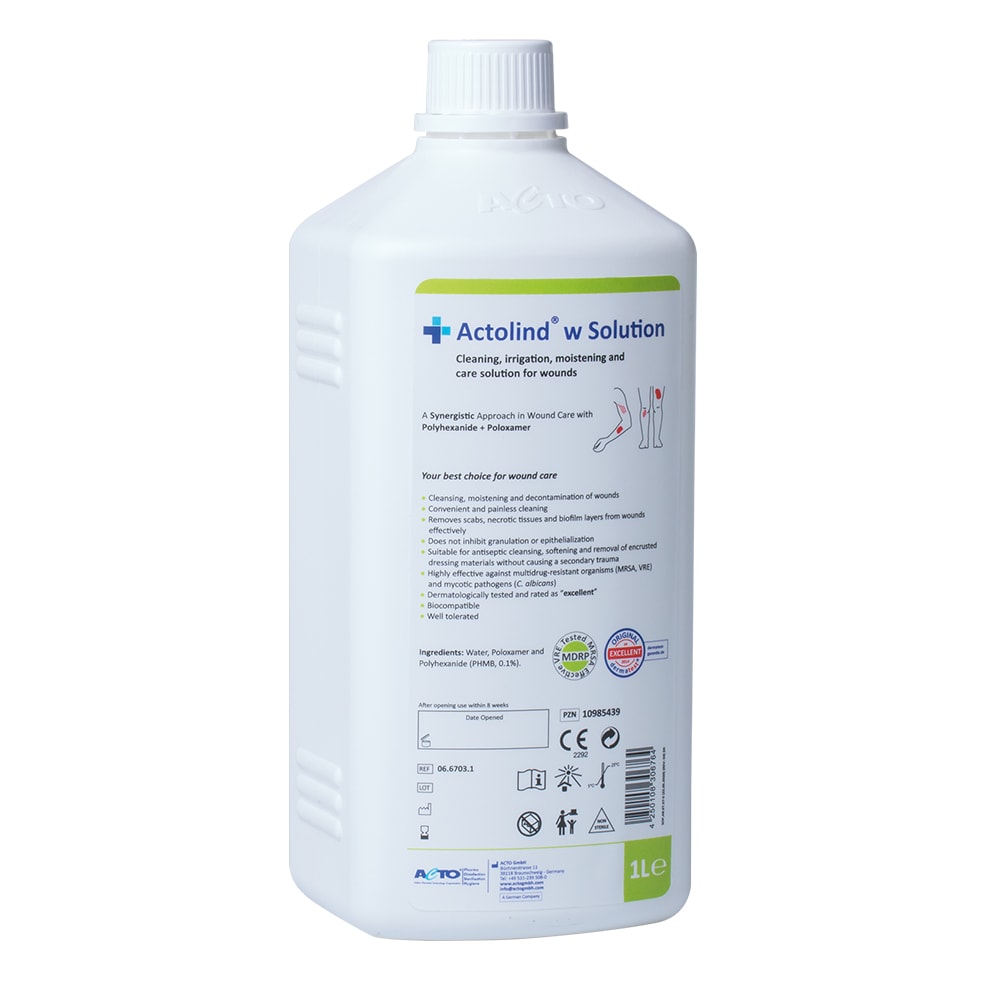 Actolind® w Solution is a cleansing, irrigation, decontamination, moistening and care solution used together with materials such as bandages, dressings, pads and wound fillers for acute, chronic and infected wounds as well as 1st and 2nd degree burns.