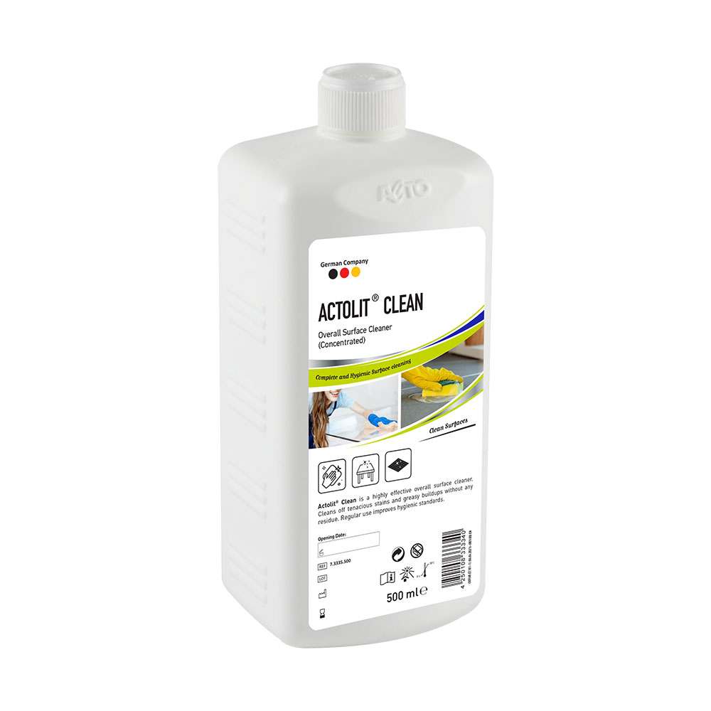 Actolit® Clean is a highly effective overall surface cleaner. Cleans off tenacious stains and greasy buildups without any residue. Regular use improves hygienic standards.