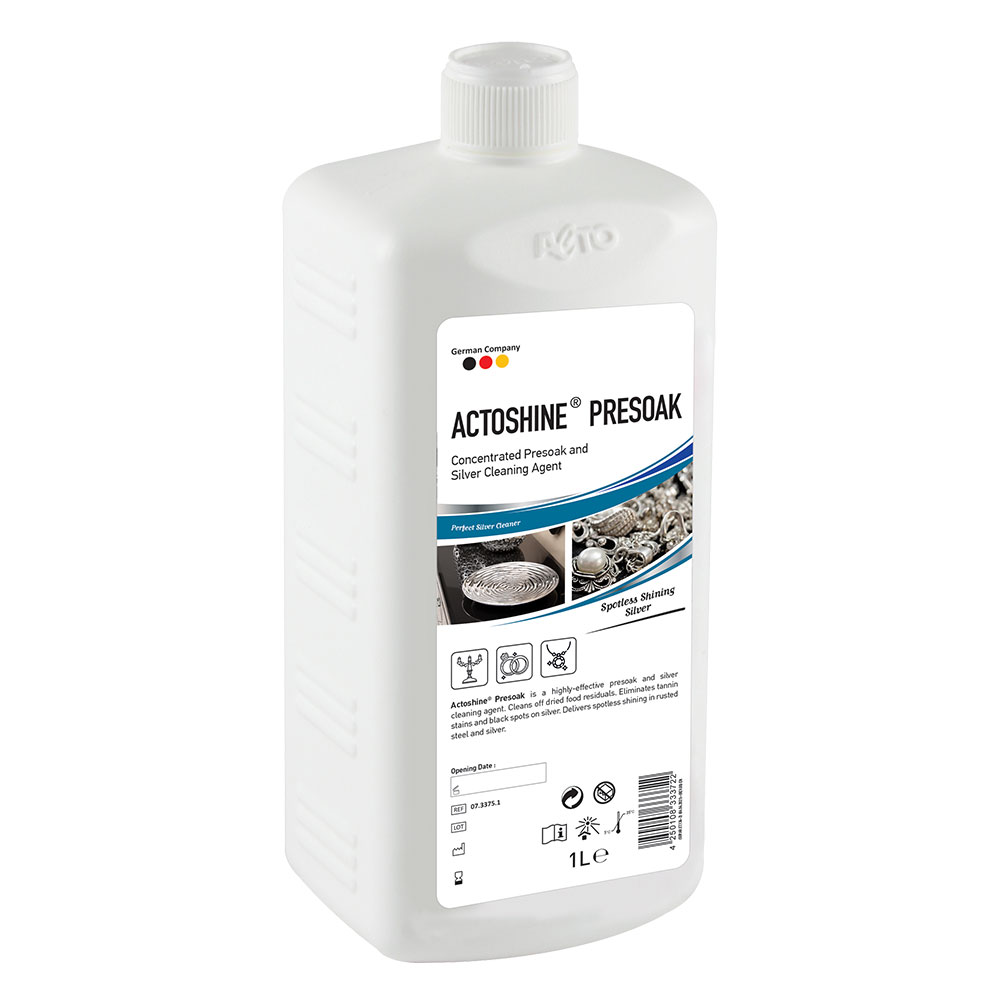Actoshine® Presoak is a highly-effective presoak and silver cleaning agent. Cleans off dried food residuals. Eliminates tannin stains and black spots on silver. Delivers spotless shining in rusted steel and silver.